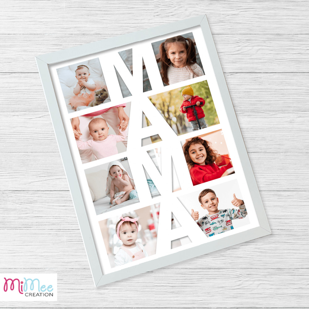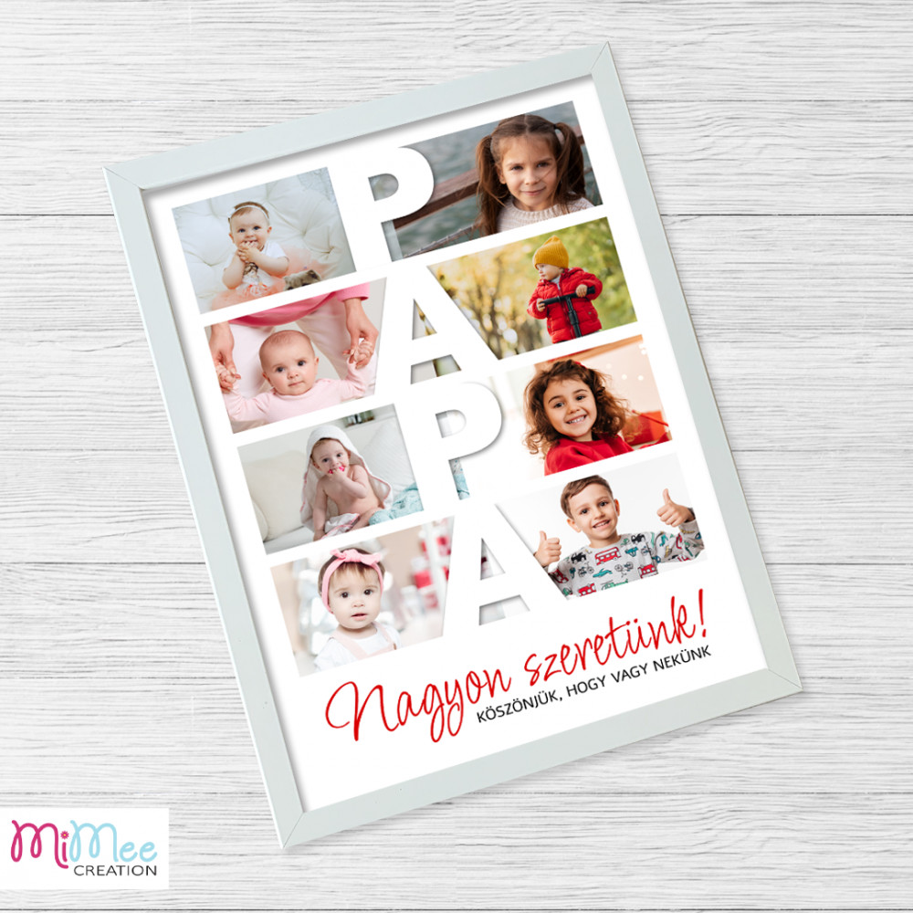 Egyedi fényképes, emlékörző kép, ami kitűnő ajándék lehet születésnapra, évfordulóra, anyák napjára, apák napjára, stb. A kép közepére 4 betűs szó (ékezet nélkül) írható: anya, anyu, mama, mami, papa, papi - vagy akár 4 betűs név is kiírható rá.