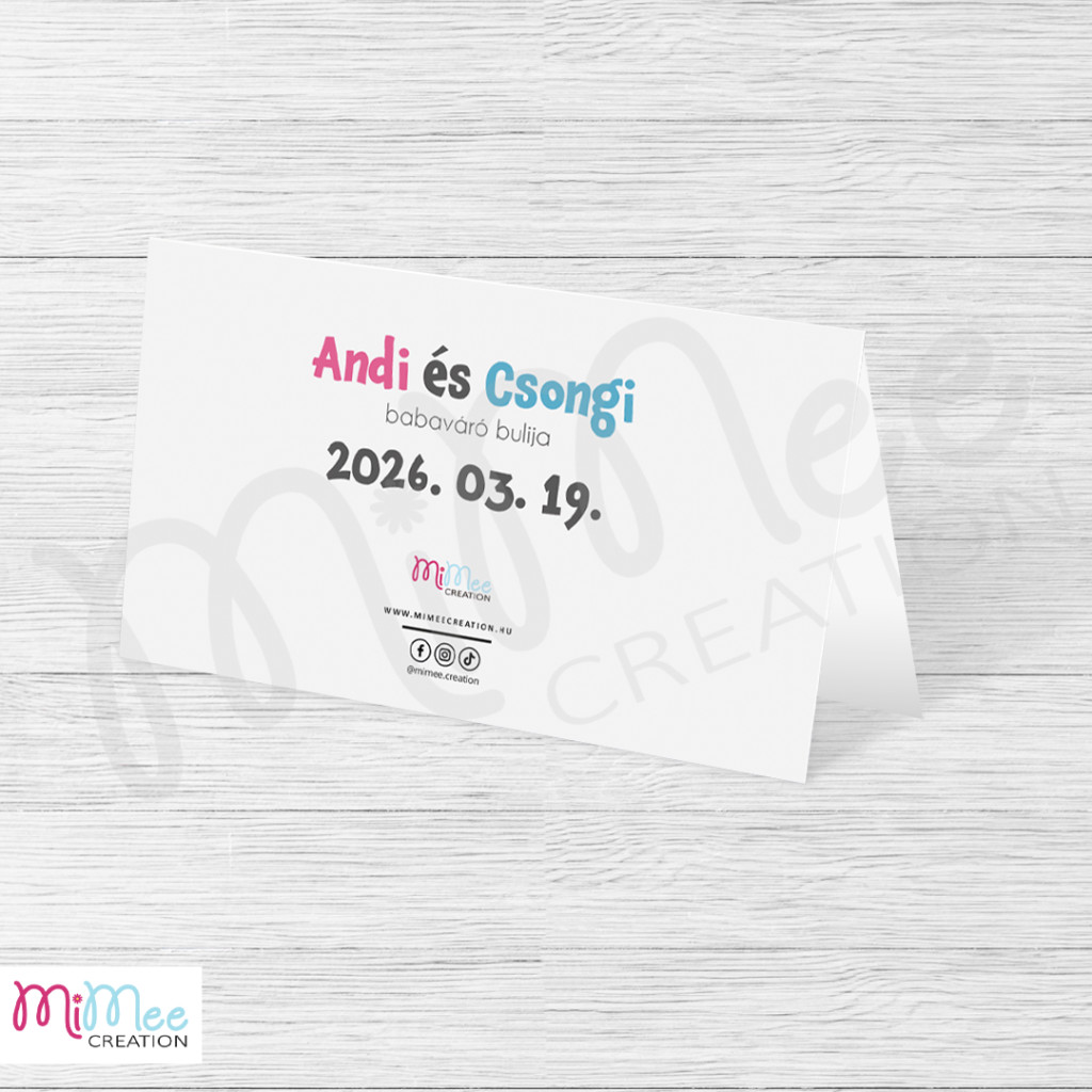 Nyomtatás: a grafika matt fehér, 250g-os prémium papírra kerül kinyomtatásra, a külső oldal egyik felére kerül a halvány szürke háttérszínes grafika és a név, a külső oldal másik részére pedig a leendő szülők keresztnevei, a parti felirat és a parti dátuma kerül, a belső oldal pedig sima fehér.
